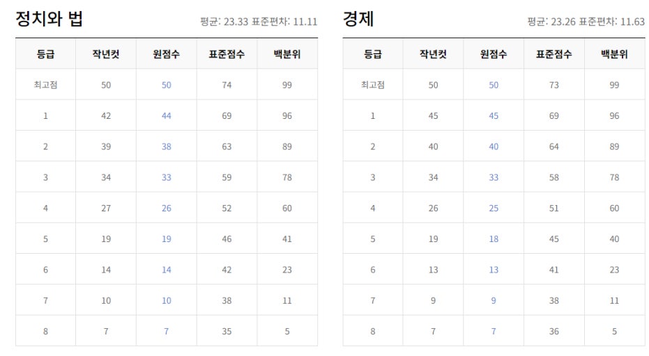 | 과목 | 평균 점수 | 등급컷 |